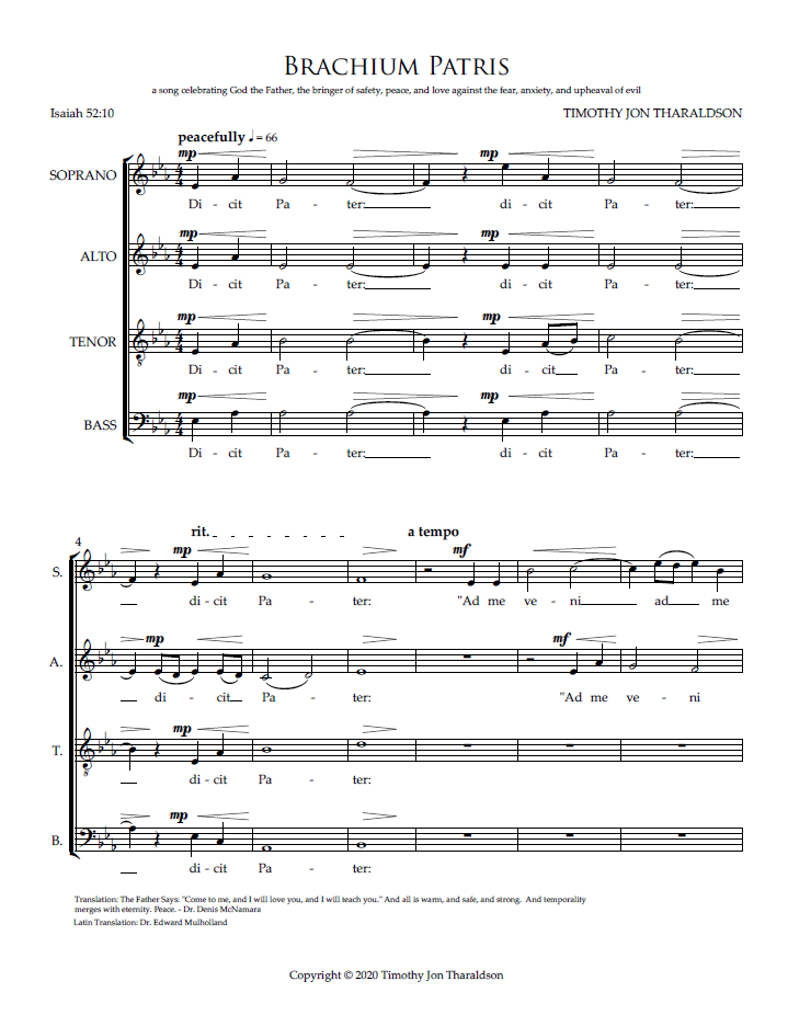 A setting of Isaiah 52:10 in Latin for SATB or TTBB voices. Translation: The Father says: “Come to Me And I will love you And I will teach you.” And all is warm And safe And strong. And temporality merges with eternity.